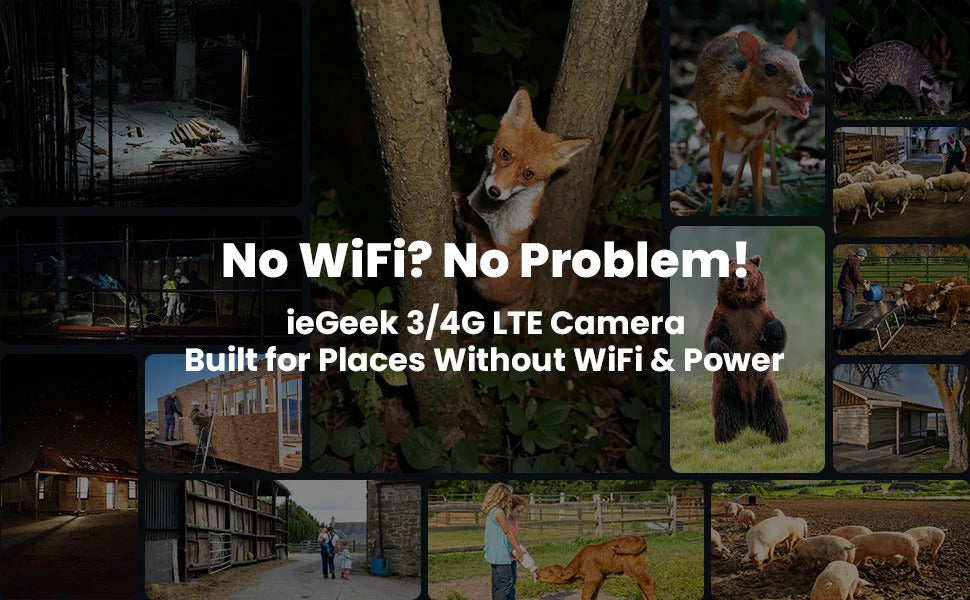 • 4G LTE Cellular Security Cameras Wireless Outdoor: ieGeek 4G LTE cellular camera is designed for places without wifi & electrical power, this security camera can work with nationwide 4G network, 100% wire-free, no wifi needed, perfect for outdoor places, such as barn, farm, ranches, construction sites, vacations homes, warehouse, RVs, wildlife studies. With IP66 waterproof, the security camera perform well in bad weather like rain and cold.