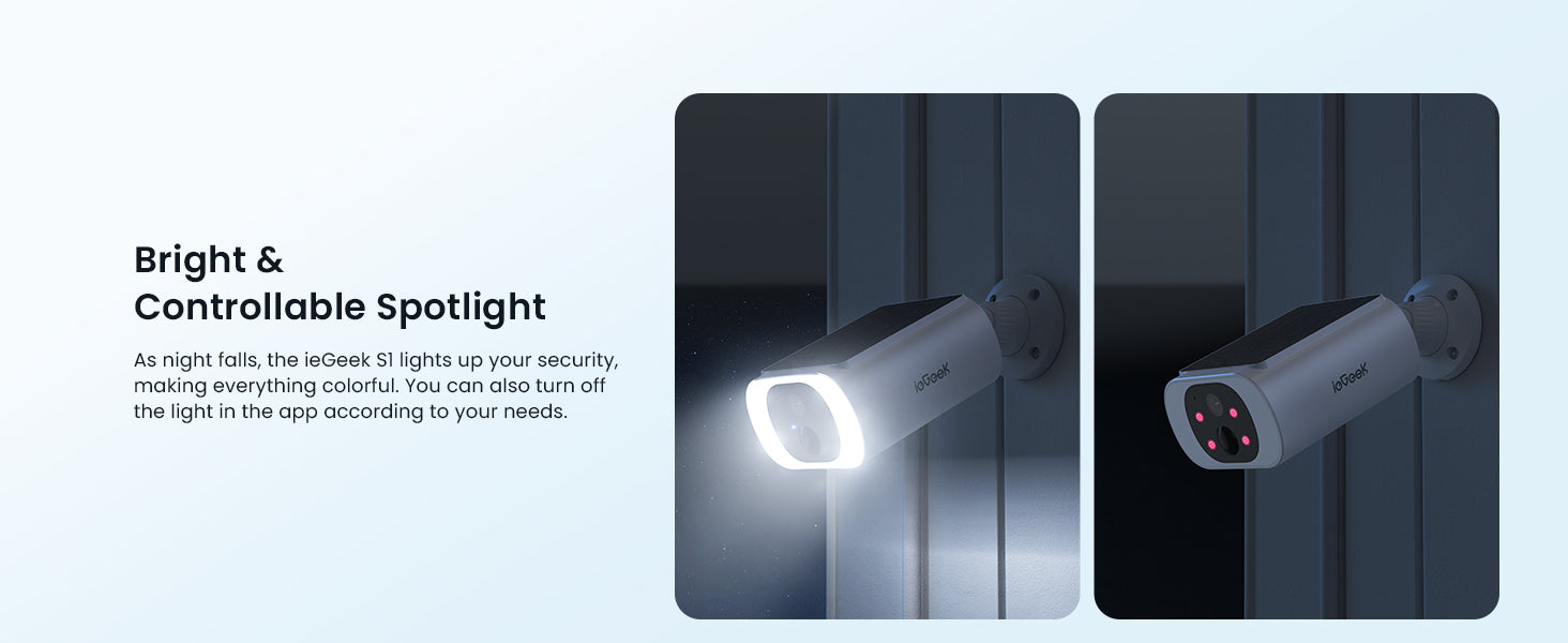 As night falls, the ieGeek S1 lights up your security, making everything colorful. You can also turn offthe light in the app according to your needs.