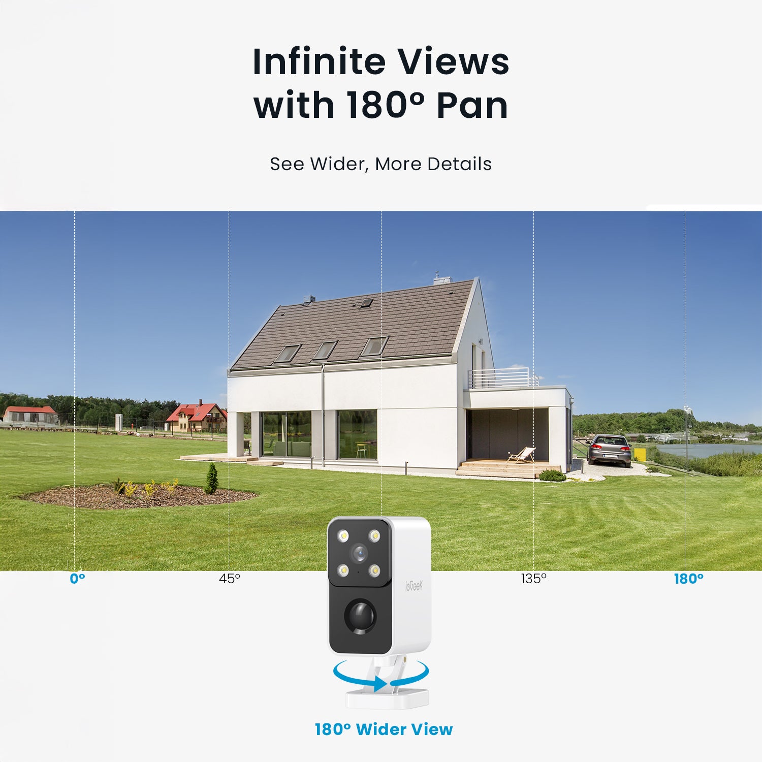 • 180° Horizon Coverage, Fewer Blind Spots: This outdoor security camera wireless has a 180° full horizontal rotation capability. Effortlessly scan entire surroundings with just a tap, covering every angle for 180° pan coverage that traditional home security cameras simply can't match. Zero Blind Spots, Ultimate Peace of Mind. ieGeek security camera offers a 2-year warranty.