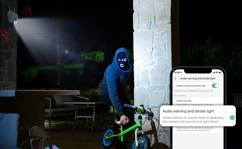 is turned on, you can choose "sound alarm", "white light alarm", "sound and light alarm" three modes.