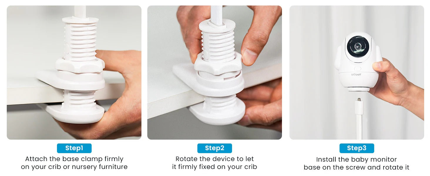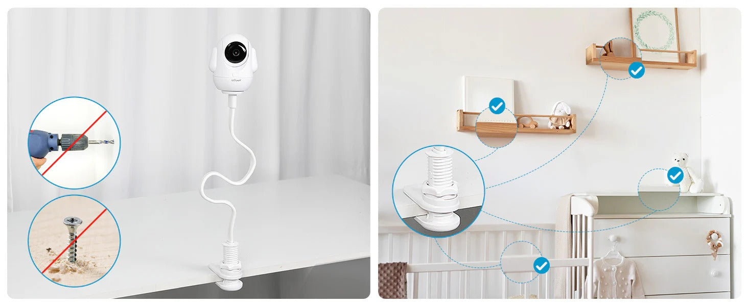- Easy Installation: No drilling required, can be installed and removed at will. The baby monitor stand has a sturdy clip that can be clamped on objects up to 8 cm thick, such as cribs, bedside tables and other furniture. There are also anti-slip pads on the clip, which not only fixes it more firmly, but also will not scratch your furniture.