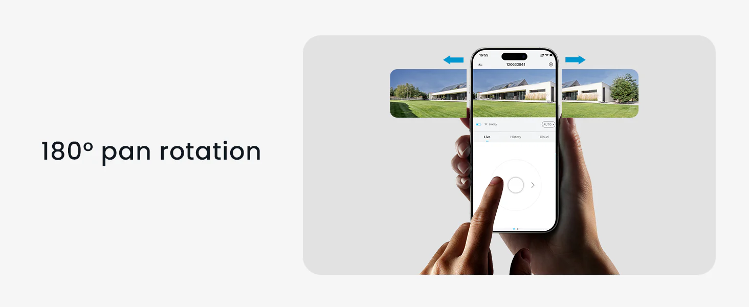 Upgrade your monitoring with 180° Pan Rotation. Its smooth, silent rotation wipes out blind spots, covering every corner of your space. Whether tracking yard activity or entryways, it adjusts seamlessly—turning a fixed view into full-area coverage for all-around peace of mind.