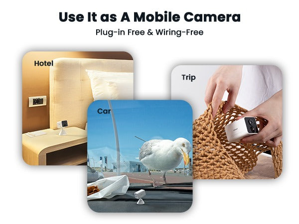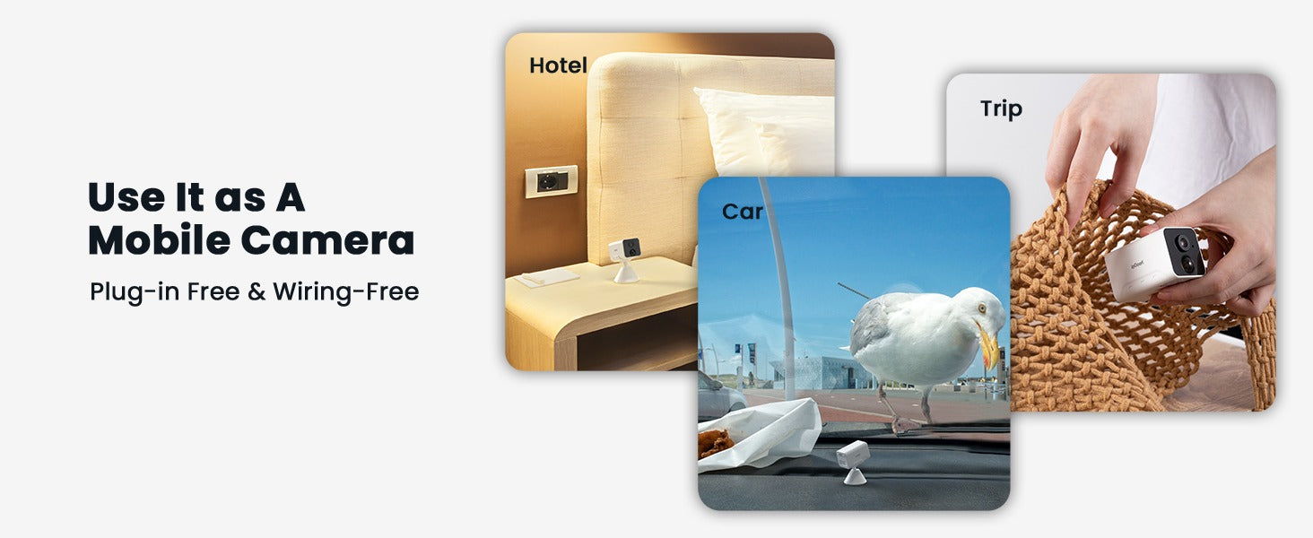 • 100% Wire-Free & A Mobile Camera: With long time battery life and intuitive installation, this security camera indoor wireless provides true peace of mind. You can place it anywhere indoors with no cords or cables needed. With the included 2 double-sided adhesive pads, you can place it on a flat surface, or stick it on a slope, a wall, a cabinet, etc. The camera has a compact and refined appearance, you can even take it on a trip.