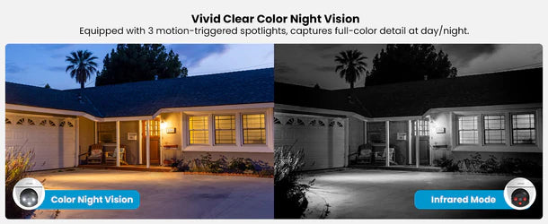 Equipped with 3 motion-triggered spotlights, captures full-color detail at day/night.
